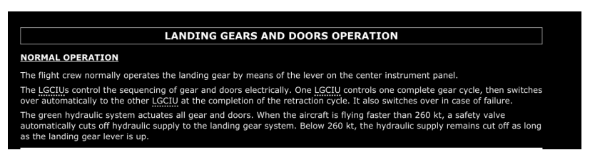 supply to the landing gear system. Below 260 kt, the hydraulic supply remains cut off as long